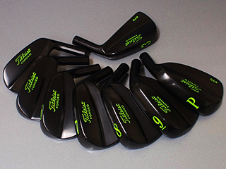 使い込まれた愛着のあるアイアンのレストアヘッド 全体的に細かなあたりキズが・・・軟鉄アイアンの場合はどうしてもクラブ同士のあたりキズが多くありますね。入念な研磨を行いメッキはグロスブラックに。ペイントをライムグリーンにカラーリングし仕上げています。お客様はこのグリーン色がラッキーカラーだそうで、キャディーバックや愛車にもこのカラーを基調にコーディネートしておられるそうです。