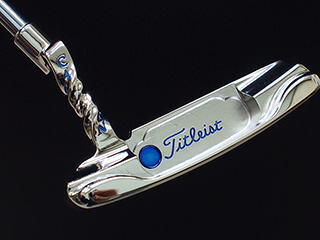 芸術的なツイストネック。やはり光沢系での仕上げは独特な雰囲気があります。ネックのねじれ部分の光加減・・・・見入ってしまいます。ネックには刻印が入っています。この刻印の文字もねじれていますがペイントがしっかり入っていて文字はねじれながら読み取る事が出来ます。あとソール部にネーム彫刻とミルド加工施し、フェース部には会社のロゴマークを彫刻。カラーはクリアブルーをペイントしプラチナシャインメッキで仕上ています!