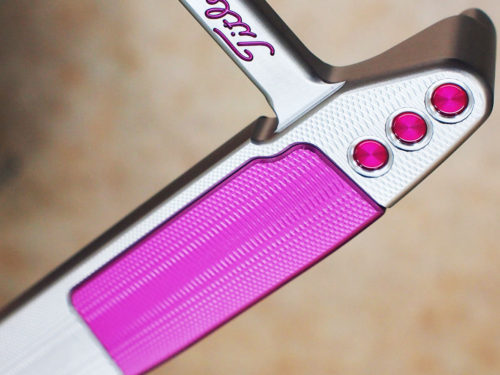キャメロンパターインサート部分のメッキとペイントカスタムのご依頼です。カラーリングに関してはクリアピンクで全ての刻印 ウエイトを剥離し洗浄 そして下地処理を施しペイント作業を行っています。インサートは取り外し特殊加工でハイパーピンクに仕上げております。このハイパーカラーメッキですが、カラーはピンク以外にブルーやグリーン等があり加工後の質感は非常に高級感ある仕上げです。刻印カラーやドットカラーに合わせてコーディネイトしたカスタムパターはグリーン上では目立つこと間違いないでしょう。