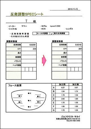 ホーム ブログ 反発調整 2013.11.05 反発調整 #高反発 T 様 ヤマハ インプレスX Z202 加工前の反発係数が 0.8200 加工後が 0.8318 ⇒ 調整後0.011アップです!こちらのお客様は2本目の加工です。飛距離アップの方法はリシャフト等いくつかありますが一番の近道は反発係数調整です。調整後すぐに結果が表れる・・・・・! 実際に体験してみてください!! Tweet シェア ブログ一覧に戻る