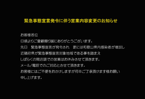 ホーム ブログ 緊急事態宣言発令に伴う営業内容変更のお知らせ 2020.04.08 緊急事態宣言発令に伴う営業内容変更のお知らせ お客様各位 日頃よりご愛顧賜り誠にありがとうございます。 先日 緊急事態宣言が発令され 更には和歌山県内感染者が増加し 近隣府県が緊急事態宣言対象地域である事を踏まえ しばらくの間店頭での営業はお休みさせて頂きます。 メール/電話でのご対応とさせて頂きます。 お客様にはご不便をおかけしますが何卒ご了承頂けます様お願い 申し上げます。 Tweet シェア ブログ一覧に戻る