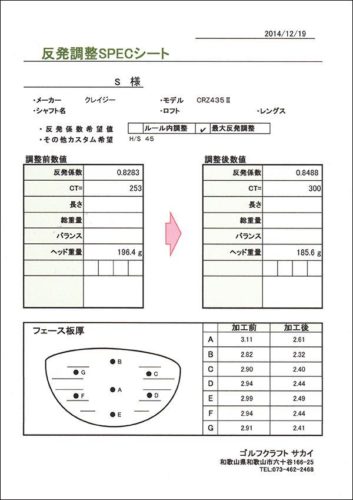 ホーム ブログ 高反発加工 2014.12.19 高反発加工 #高反発 S 様 クレイジー CRZ435Ⅱ ご依頼人様のヘッドスピードが45 限界値ギリギリまでの研磨を行い反発係数0.8488までアップさせています。加工前の反発係数が 0.8283 調整後0.020アップここまでアップするとセカンドのショットが楽になりますね!飛距離に余裕が出ると ティーショットは力まずスイング出来ます。飛距離アップに繋がること間違いなしです! Tweet シェア ブログ一覧に戻る