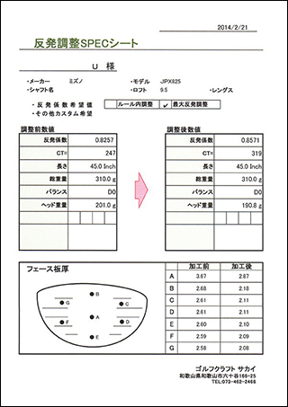 最大反発調整のご依頼です加工前の反発係数が 0.8257 加工後が 0.8571 ⇒ 調整後0.031アップです