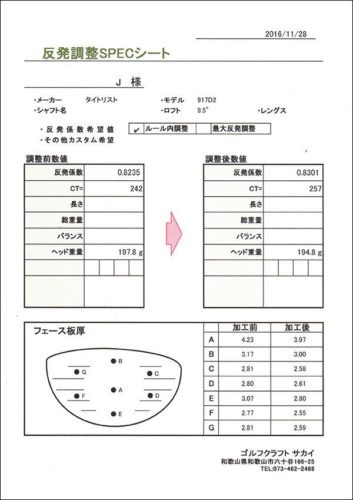ホーム ブログ 高反発加工 2016.11.28 高反発加工 J 様 タイトリスト ルール内反発調整のご依頼です。加工前の反発係数が 0.8235 加工後が 0.8301 ⇒ 調整後0.006アップです。ルール内での加工ですので劇的な数値の変化はありませんが、少しの差でも飛距離アップを実感頂けると思います。 Tweet シェア ブログ一覧に戻る