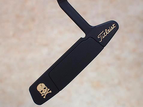 スコッティキャメロンのNewport2 ブラック仕上げ!シーミスト仕上げのキャメロンパターをブラック化・・・ヘッド仕上げをTf-9ブラック仕上げにフェース面トゥ側にはスカルを彫刻し、グリップ・ウエイト・シャフトバンドはカモフラ柄で統一させています。そしてカラーに関してはゴールドでカラーリングし仕上げています。ブラック仕上げのヘッドにゴールド色のスカル彫刻 まさに強靭なイメージ・・・ここ一番大事なパッティング時の相棒にどうでしょうか!