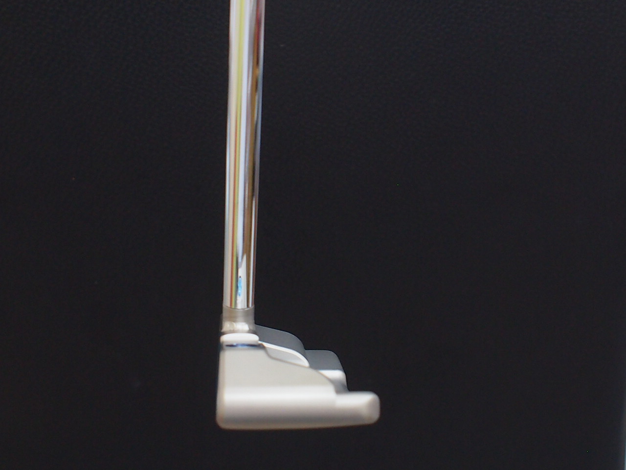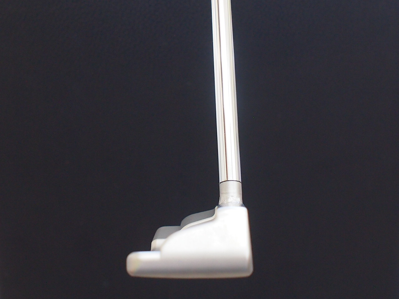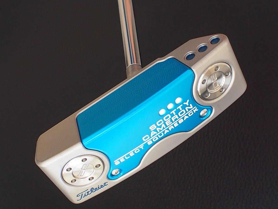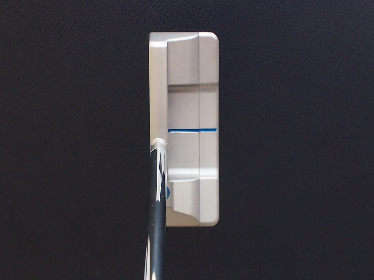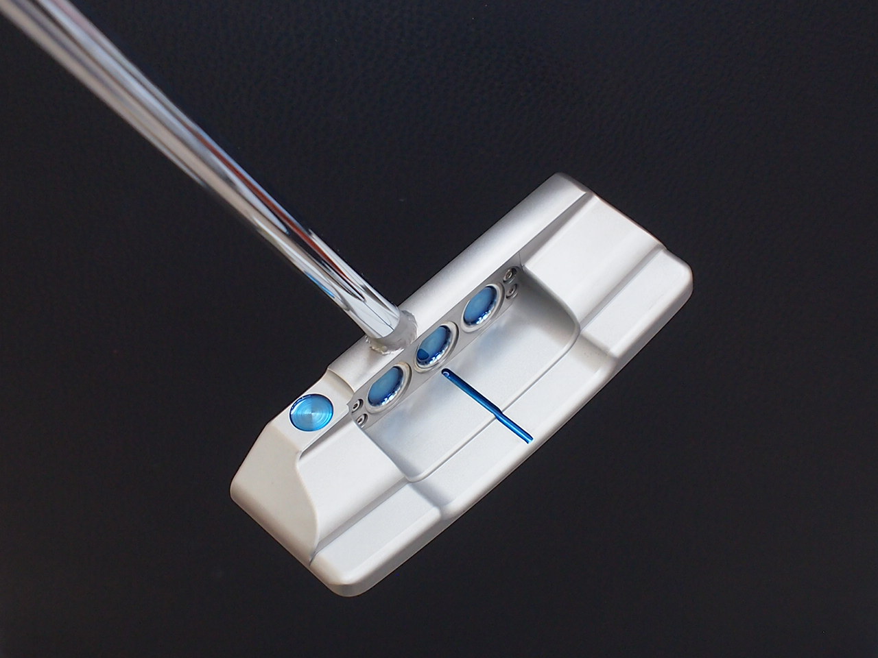 スクエアバック通常市販品ではベントシャフトが基本なのですがツアーパター仕様のようにセンターシャフトにカスタムをしたスクエアバックです。シャフト延長線上でボールをヒットできオフセットモデルとはちがう操作性の良さを体感して下さい。トップブレード後方にセットアップ時に役立つアライメントドットも装備したモデルです。ペイント:クリアブルー