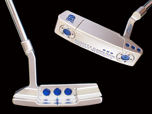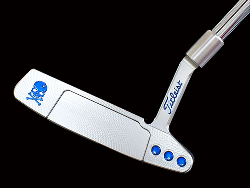 スコッティキャメロンのNew Port2カスタムパター!シーミスト仕上げのキャメロンパターをプラチナシャインメッキ仕上げに・・・さらにフェース面トゥ側にはスカルを彫刻しカスタマイズℤしました。スカル彫刻は力強いイメージがありパッティング時の相棒にどうでしょうか!カラーリングについてはヘッド全体の刻印やボンブ全てをクリアブルーに仕上げています。