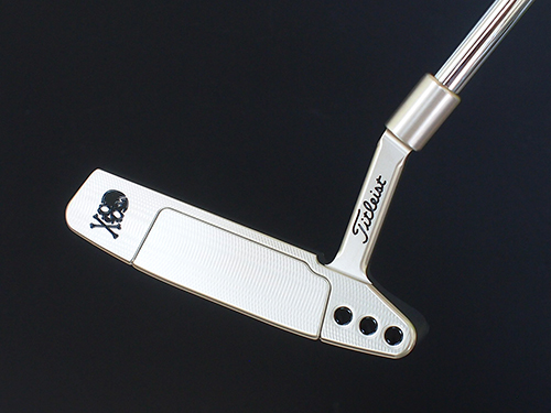 スコッティキャメロンのNewport2カスタムパター!シーミスト仕上げのキャメロンパターをプラチナムメッキ仕上げに・・・さらにフェース面トゥ側にはスカルを彫刻しカスタマイズしました。ブラックカラーのスカル彫刻は力強いイメージがありパッティング時の相棒にどうでしょうか!カラーリングついてはヘッ全体の刻印やボンブはブラックにフランジ部のサイトラインをレッドカラーで仕上げています。