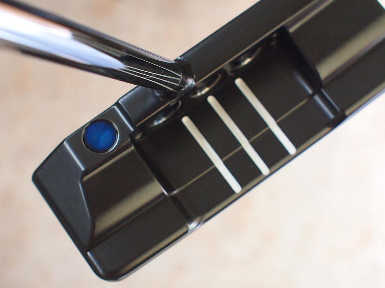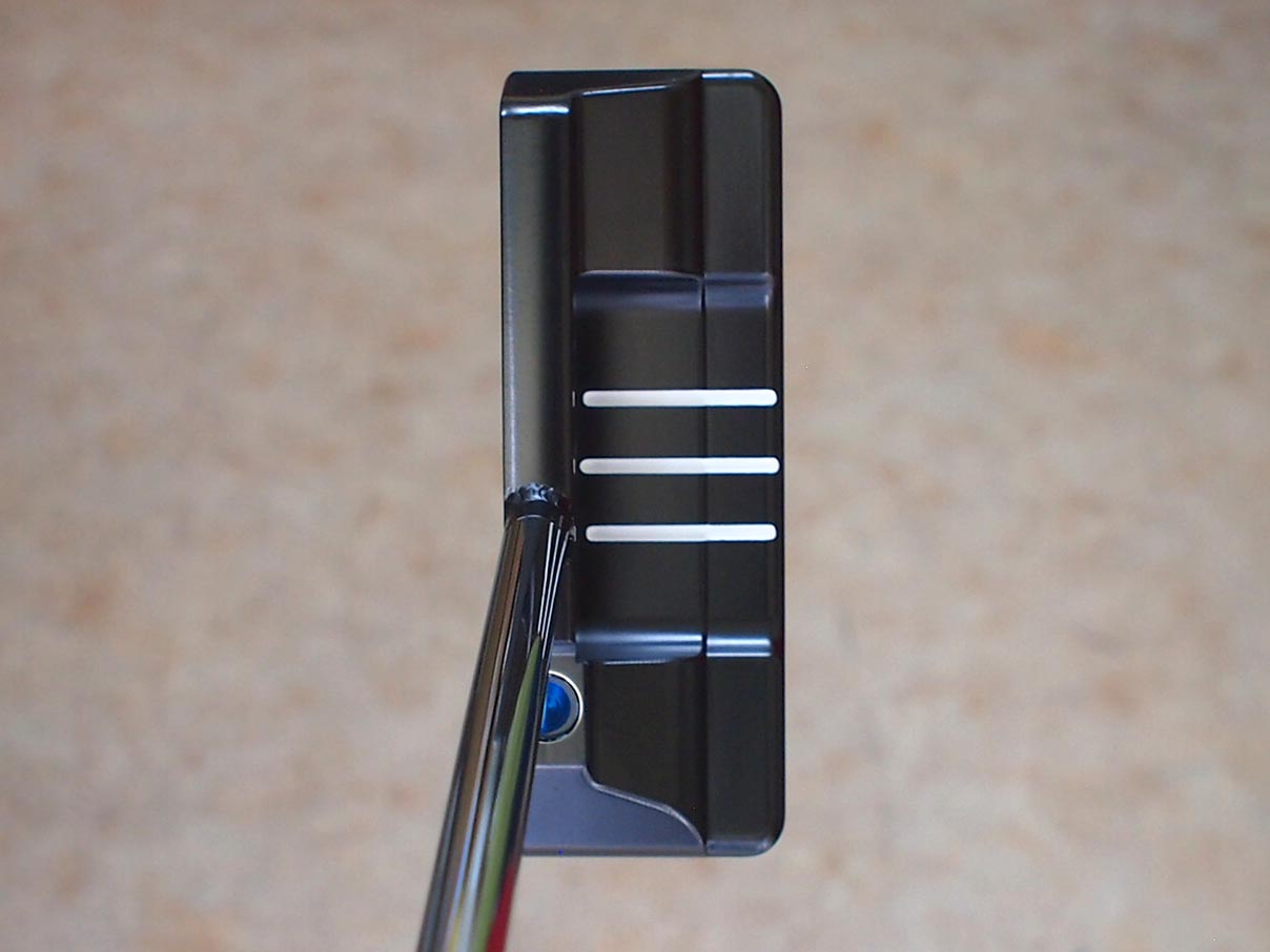 スクエアバック通常市販品ではベントシャフトが基本なのですが、ツアーパターの仕様のようにセンターシャフトにカスタムをしたスクエアバックです。シャフト延長線上でボールをヒットできオフセットモデルとは違う操作性の良さを体感して下さい。トップブレード後方にセットアップ時に役立つアライメントドット、そしてフランジ部にサイトライン2本追加した特別な仕様のモデルです。フェースとボディの間に施されたバイブレーションダンピングシステムソフトな打感と打音へと2018モデルは改良し心地よいフィーリングを更に向上させたモデルです。ペイント:クリアブルー