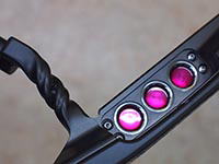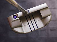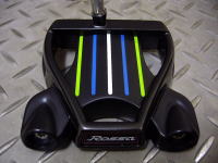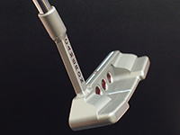 | H 様 サイトライン彫刻 1本のサイトラインを両サイドに4本プラス合計5本に! こちらの加工は先ずシャフトの脱着が必要な事とアルミボディーとフレーム部分の分解も必要になります 画像には写っていないですがフェースインサート(ステンレス)も交換しています サイトラインがターゲットに対し太いイメージラインを描ける様なパターに仕上がったかと思います カラーは中央からホワイト・ブルー・ライムグリーンでペイントしています |